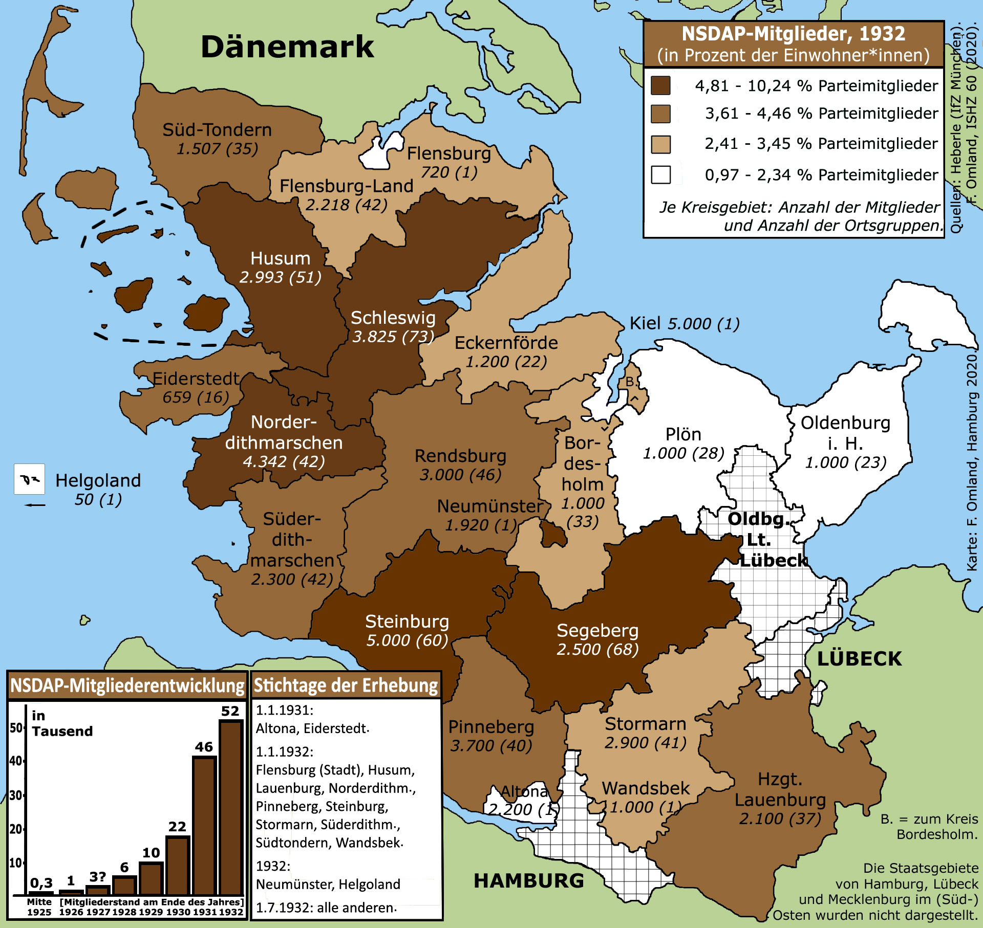 [22] Wenn nicht anders angegeben: Stokes, Kleinstadt und Nationalsozialismus, S. 94, S. 94 (FN 4), S. 150, S. 173, s. 183, S. 202, S. 206. (Darin: Details zu den Ortsgruppen im Landesteil Lübeck).